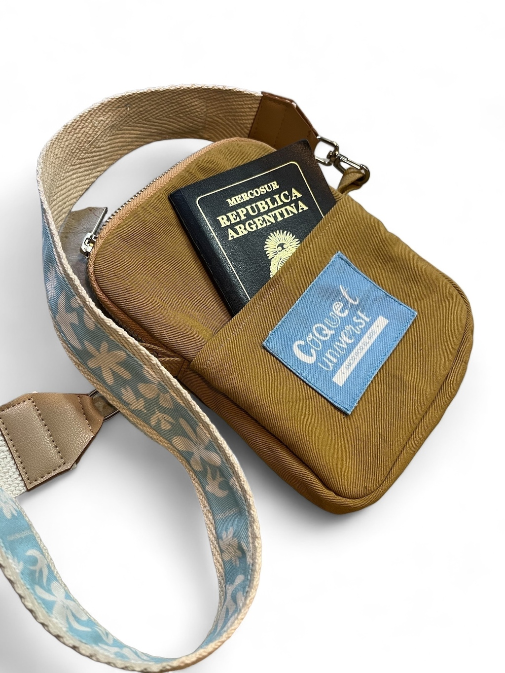 Correa colgante, base de algodón y cinta estampada, con mosquetones en los extremos que permite engachar el accesorio al bolsito.